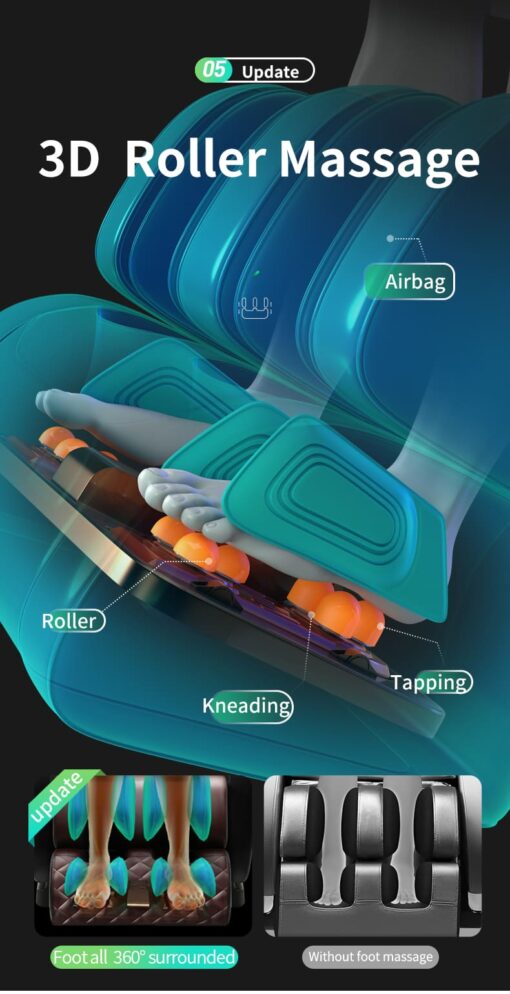 - Foot Roller Massage: The foot massage rollers are complemented by the comprehensive airbag massage.